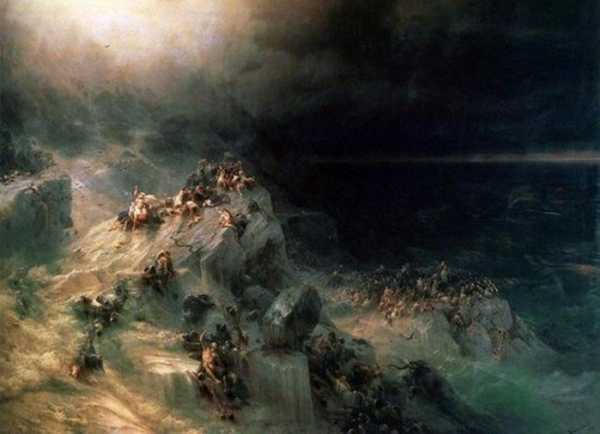 Вдруг произошло содрогание земли, после чего часть суши начала свое погружение в ошалевшие потоки. Все, что было на суше, начало опускаться под воду все ниже и ниже.