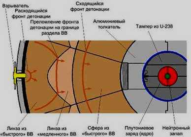 Заряд для атомной бомбы РДС-1 представлял собой многослойную конструкцию, в которой перевод активного вещества — плутония в надкритическое состояние осуществлялся за счет его сжатия посредством сходящейся сферической детонационной волны во взрывчатом веществе.