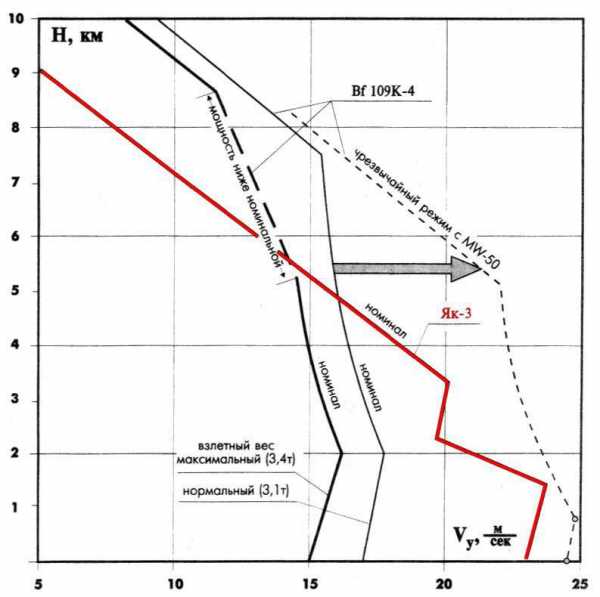 Известно, что максимальная скорость и скороподъемность существенно зависят от режима работы мотора. Одно дело длительный или номинальный режим, и совсем другое – чрезвычайный форсаж. Это хорошо видно из сопоставления максимальных скоростей лучших истребителей завершающего периода войны. Наличие режимов повышенной мощности существенно улучшает летные характеристики, но лишь на непродолжительное время, так как в противном случае может произойти разрушение мотора. По этой причине очень кратковременный чрезвычайный режим работы мотора, дававший наибольшую мощность, не считался в то время основным для работы силовой установки в воздушном бою. Он предназначался для использования только в самых экстренных, смертельно опасных для летчика ситуациях. Это положение хорошо подтверждает анализ летных данных одного из последних немецких поршневых истребителей — Мессершмитт Bf 109К-4.