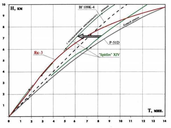 Несколько иначе, чем у Bf 109K-4, обстояло дело у «Мустанга» и «Спитфайра» XIV. Мотор V-1650-7, стоявший на Р-51D, имел не только 5-минутный чрезвычайный, но и 15-минутный боевой режимы работы. Этого времени было достаточно для ведения активного воздушного боя, и «Мустанг» постоянно имел преимущество в скорости во всем диапазоне высот по сравнению с Bf 109К-4. Правда, даже в этих условиях скороподъемность Р-51D была хуже, чем у советских истребителей, «Спитфайра» и Bf 109К-4. Данный его недостаток обуславливался вполне естественной причиной— гораздо большим относительным запасом топлива. Много топлива требовалось для получения весьма значительной для истребителя дальности полета, необходимой для сопровождения тяжелых бомбардировщиков.
