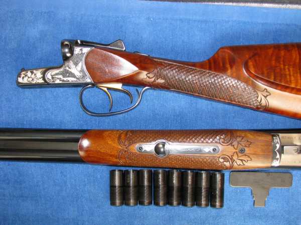 Оказывается, это ружье стояло в магазине давно, но стоило почти как новое. Поэтому-то я и не обращал на него внимания. Но все-таки была причина, по которой хозяина убедили существенно поступиться — на левом стволе перед чоком снизу имеется едва заметное поддутие. Возможно, выстрелили не подходящей по размеру пулей. Но сам чок и пайка ствола дефектов не имели. Я с трудом представляю, на что могло бы повлиять такое поддутие размером около 0.1 мм, поэтому решил на этот счет особенно не заморачиваться.