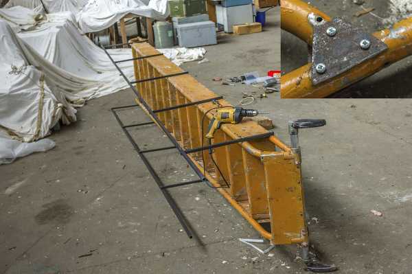 14. Дорабатывать трап мне помогал мой тогдашний студент Олег. Мы отремонтировали сломанный узел, а из квадратного стального профиля собрали перила. Вес стремянки увеличился, но перила придали ей дополнительную прочность.