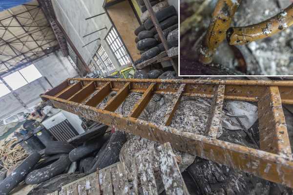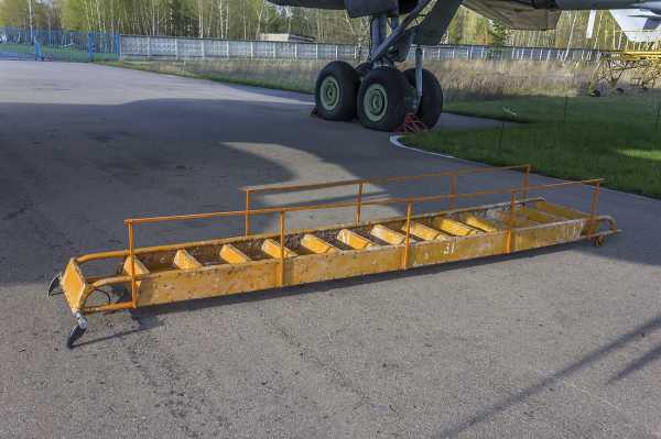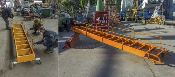 13. Куда более сложной задачей стала подготовка трапа. Вход в самолёт находится на довольно приличной высоте, но имеющиеся в музее аэродромные стремянки для доступа посетителей по разным причинам не подходили. Штатная стремянка пребывала в ангаре в довольно унылом виде, грязная и сломанная. Ввиду отсутствия перил пускать по ней посетителей (особенно с детьми) было опасно.
