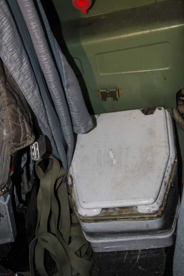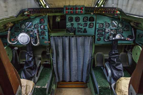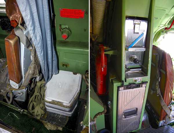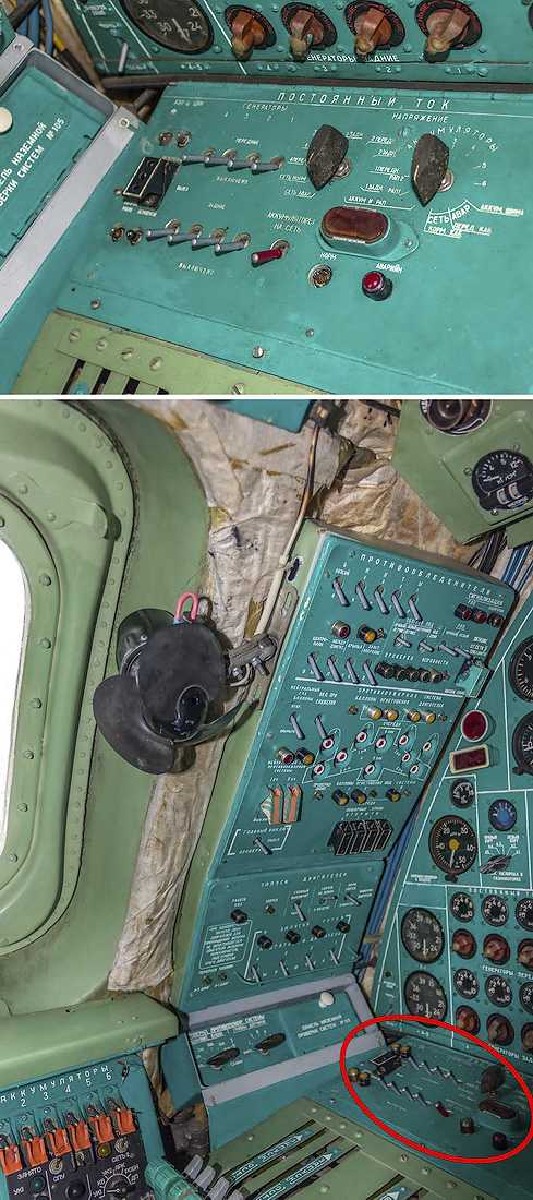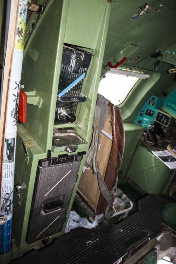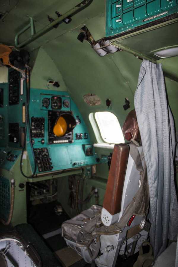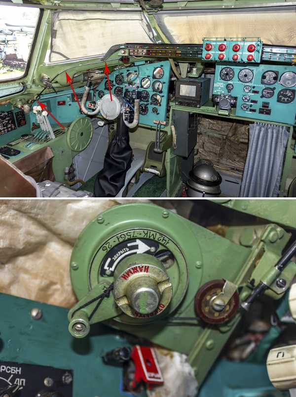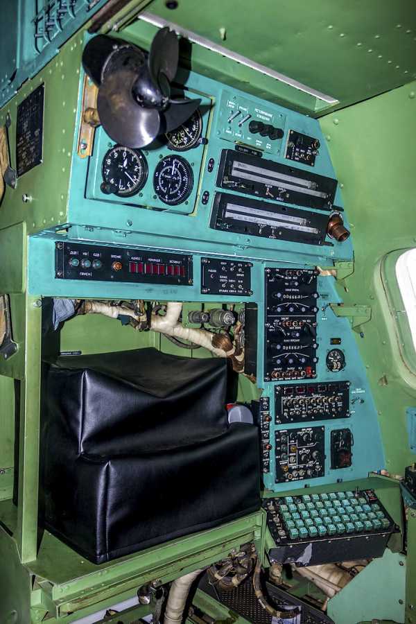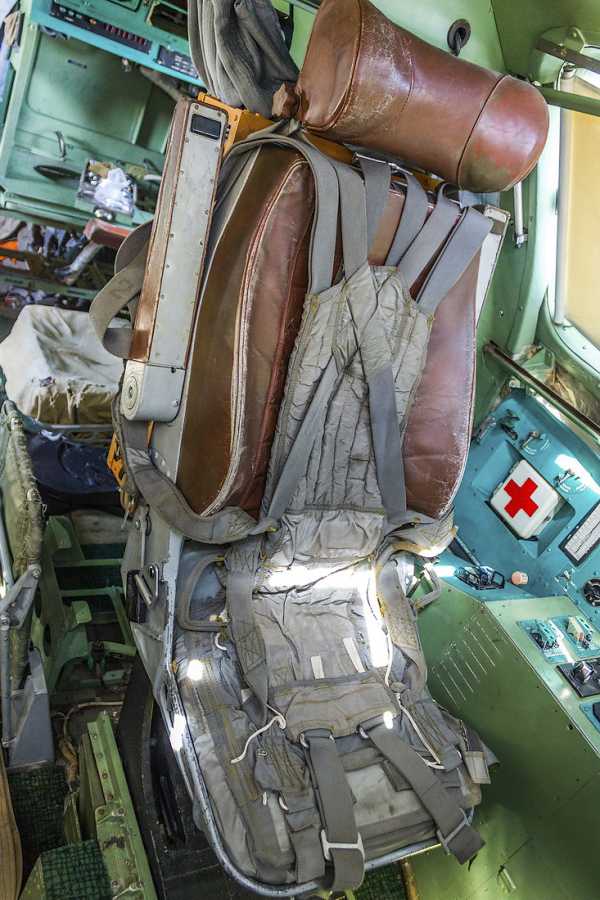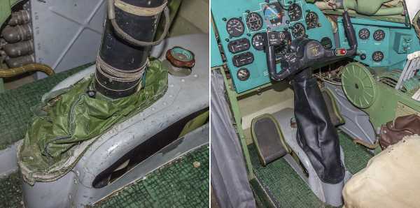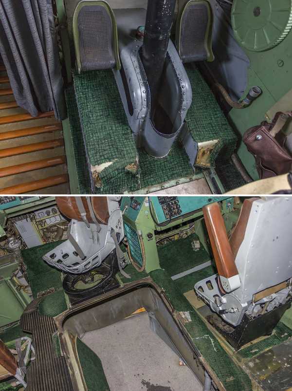 Это место первого и второго пилотов. Но самое интересное, это резиновая дорожка с деревянными перекладинами внизу. Это – система аварийного покидания самолёта. Дело в том, что из-за винтов, катапультировать из самолёта вверх нельзя – может порубить. Вниз – не позволяет конструкция. Поэтому конструкторы предложили такое решение. Во время аварийной ситуации, эта дорожка начинает двигаться, как конвейер. Всё что нужно сделать члену экипажа – это ухватиться за неё рукой и проехать до люка, через который они в самолёт вошли.