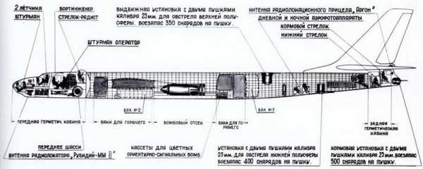 Схема размещения экипажа, оборудования и вооружения в фюзеляже самолета-ракетоносца Ту-95 К