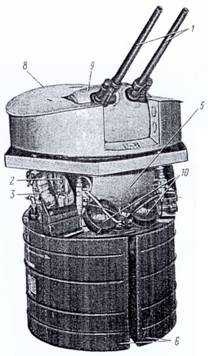 1 – пушки АМ-23; 2 – привод горизонтальной наводки 3 – приводной мотор ДВ-1100А; 5 – рама; 6 – патронные ящики; 8-экран; 9-обтекатель; 10- баллоны сжатого воздуха.