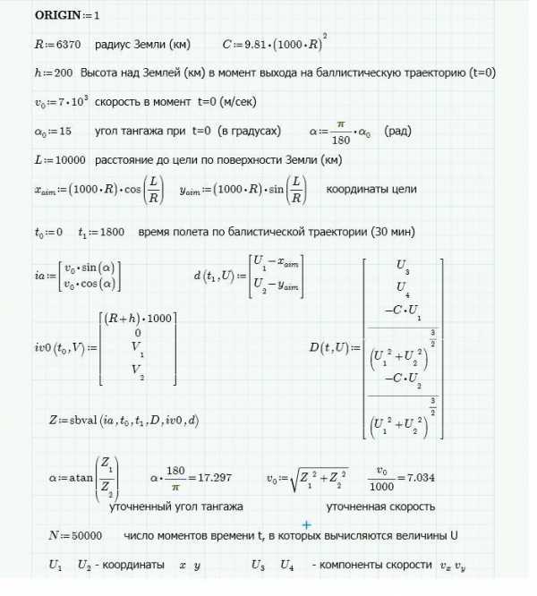 Начнем с классической МБР типа Минитмен-3, апогей которой оценивают в 1100 км. Тогда время баллистического полета на дальность км при км/сек и град. составит 30 минут ( сек). Уравнения движения БЧ в поле гравитации Земли выписаны в статье http://extremal-mechanics.org/archives/142, а здесь решается в MathCad система дифф. уравнений, которая получена после понижения порядка.
