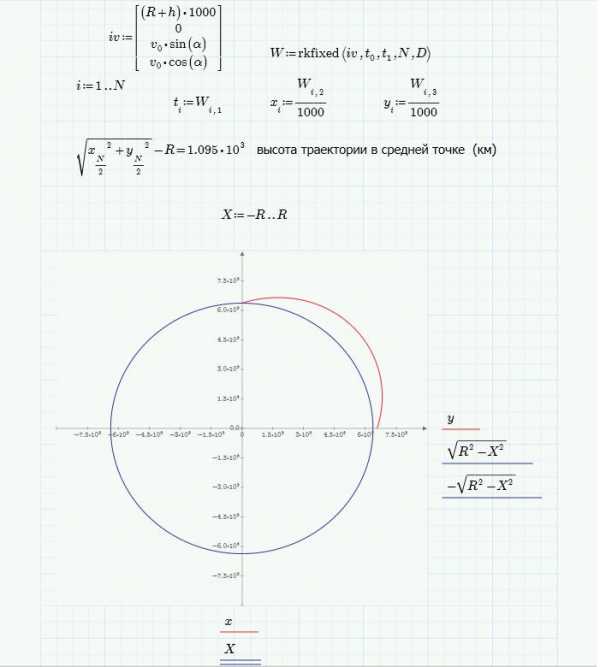 Что касается настильной траектории «Тополя-М», которая проходит чуть ли не параллельно земной поверхности на высоте 200 — 250 км, то это бред, придуманный журналистами. Предельный случай такой траектории получается в MathCad-е при начальных скорости км/сек и угле тангажа град, и выглядит это вот как: