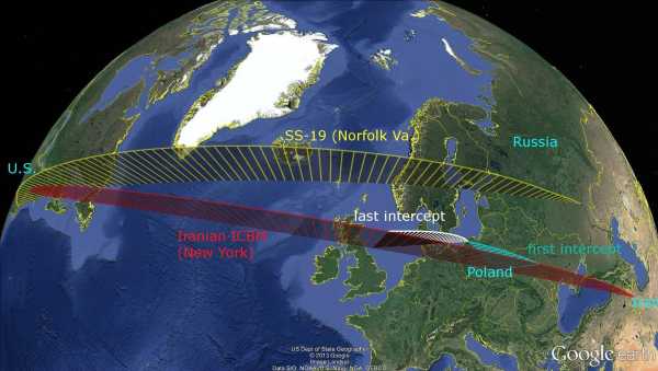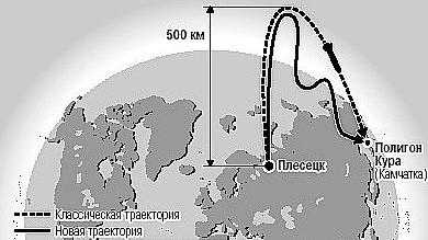 Например разница в скоростях двух БЧ, которые находятся в апогеях 500 и 1100 км — 6.9 и 5.9 км/сек соответственно, вряд ли существенна для наведения ракеты-перехватчика. Более того, достать низко летящую БЧ намного проще. Может быть дело в том, что чем ниже траектория, тем короче дистанция прямой видимости для радаров ПРО? Последняя равна , где км — радиус Земли. На высоте км получим км, а при км км. Если понизить апогей до км, то на всей траектории будем иметь км — это не так уж мало! Учитывая, что в обнаружении целей для ПРО и наведении перехватчиков участвуют спутники и радары на кораблях, приближение горизонта видимости за счет снижения высоты полета не выглядит критическим фактором. Хотя возможно, что относительно низко летящая БЧ все-таки затрудняет ПРО. Мы не рассматриваем здесь этот вопрос, т.к. сама возможность прижаться к матери Земле выглядит крайне сомнительно.