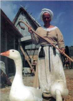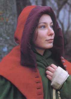 Накидку с капюшоном (heuke, huk, huke) в качестве верхней одежды носили как мужчины, так и женщины. В 1439 г. такую одежду носили лучники сэpa Джеймса Сидмора из Херефордшира, нанятые сэром Джеймсом Ормондом для участи во французской экспедиции герцога Ричарда Йоркского. Ормонд приказал, чтобы солдаты Скидмора пошили себе накидки и выделил на это деньги. Когда Жанна д’Арк попала в плен, на ней был парчовый «huque, открытый с обоих боков». Термин huke обозначал также геральдическую ливрею, в этом значении он упоминается с 1295 г. В начале XIVв. лучники носили накидки из сукна, окрашенные в красный цвет мареной (Rubia Tinctorum). Такая накидка изображена на фотографии. Лучник носит капюшон в свернутом виде, а также несет зачехленный лук. |