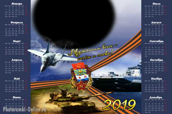 Не упустите шанс вставить фото онлайн в красивый календарь мужчин на 2019 год. Георгиевские ленточки, советская военная символика, флаги различных родов войск, военная техника – самолет, авианесущий крейсер, танк, представляющие сухопутные войска, военно-морской военно-воздушные флота СССР, текст: «Мужчинам всем – почёт и слава!». Такой календарь – превосходный подарок настоящим мужчинам, которые интересуются военной техникой.