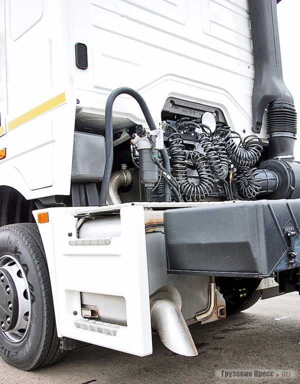 Позади кабины слева предусмотрены ступени, поручень и платформа для работы водителя с коммуникациями полуприцепа. Запасное колесо размещено перед задней осью на специальном кронштейне, а вместо него можно установить дополнительный топливный бак на 400 л.