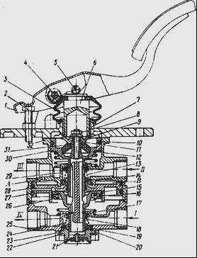 Управление рабочими тормозными системами автомобиля осуществляется двухсекционным краном с приводом от педали.