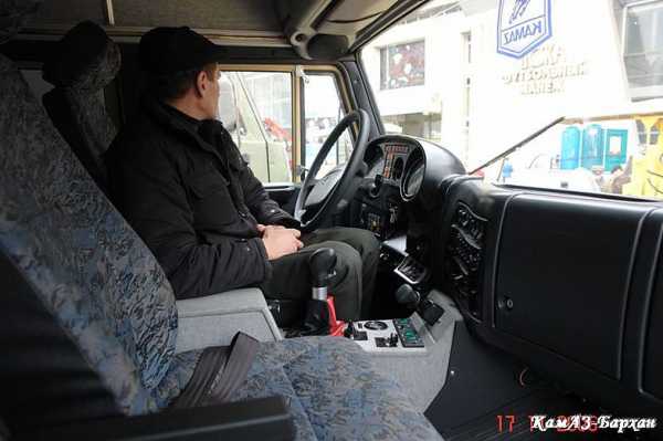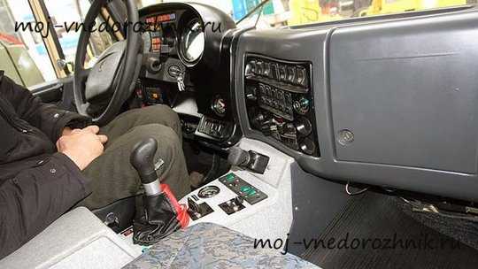 Интерьер транспортного средства выполнен с применением камазовских деталей, но ощущение, что находишься в кабине грузовика, отсутствует. Но не во всех аспектах это пошло на пользу: например, изменение посадки привело к тому, что колени постоянно упираются в рулевое колесо, при этом попытки отрегулировать его положение не приводят к положительному результату.