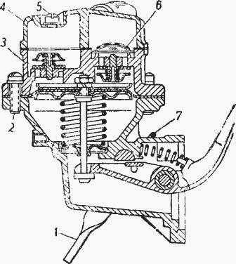 1—рычаг ручной подкачки 2—винт крепления головки (восемь шт.), 3—головка, 4—крышка, 5—винт крепления крышки, 6—фильтр, 7—оттяжная пружина.
