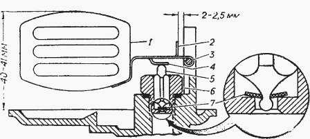 1 поплавок, 2—ограничитель хода поплавка, 3—ось поплавка, 4—язычок регулировки уровня, 5—игла клапана, 6—корпус клапана, 7— уплотнительная шайба.