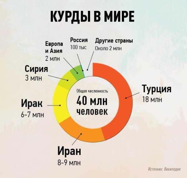 Что нужно знать? Из сорока миллионов курдов большая часть — от 13 до 18 млн — проживает сегодня в Турции, по 7 млн — в Иране и Ираке, вдвое меньше — в Сирии. Примерно два миллиона насчитывает в общей сложности курдская диаспора. Подавляющее большинство курдов — 75% — мусульмане-сунниты, каждый седьмой курд — шиит, есть последователи езидизма и зороастризма и даже курды-христиане. Территориально большая часть исторического Курдистана находится на территории Турецкой Республики (юго-восточные вилайеты страны), Сирийский Курдистан занимает северо-восточную часть Сирии, Иракский – север и северо-восток Ирака, иранские курды компактно проживают в Западном Иране.