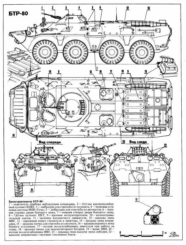 - БТР-80-основная (базовая) модификация бронемашины с пулеметом 7,62-мм ПКТ и 14,5-мм пулеметом КПВТ