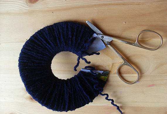 Маникюрными ножницами разрезаем пряжу по внешнему кругу.