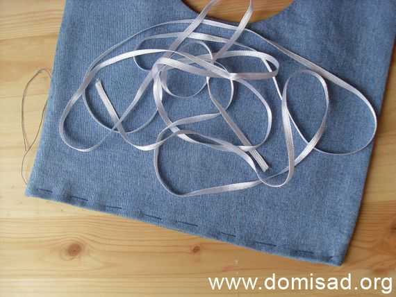 - Отрежьте пару синих атласных лент и пришейте их ровно посередине задней части с изнанки.