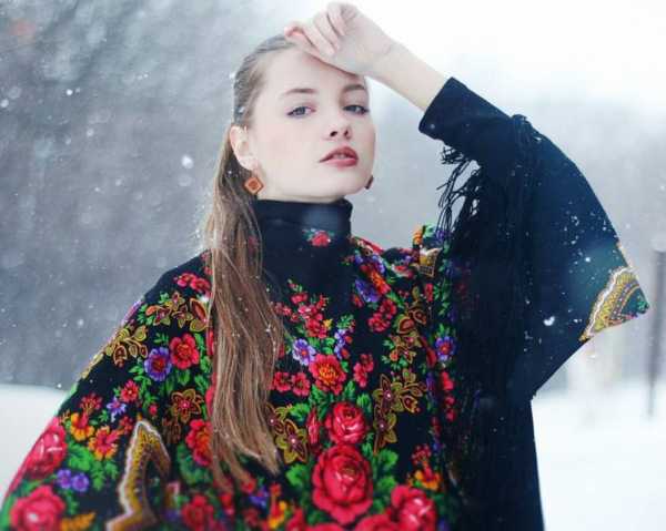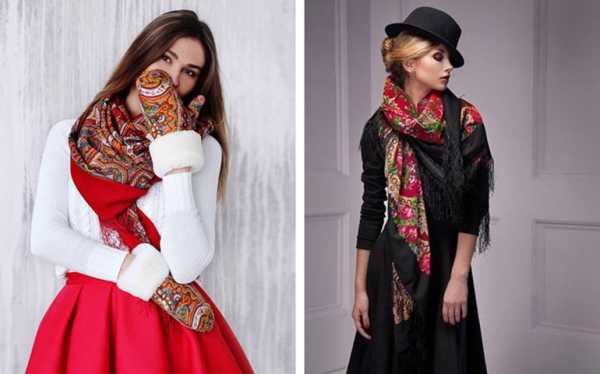 Но для холодного времени года незаменимым элементом образа считается русский павлопасадский тёплый платок, который может использоваться как головной убор или накидка на плечи поверх пальто или шубки.