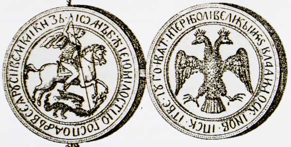 В конце XV в. первый государь объединенной Руси Иван III создает общегосударственную печать. Грамота 1497 г. Донесла до нашего времени красновосковой оттиск этой печати. На нее в свое время обратили внимание русские историки Василий Никитич Татищев и Николай Михайлович Карамзин. В «Истории государства Российского» Карамзин отметил, что символика российского державного герба ведет начало от этой печати. На ней впервые соединяются и остаются не разрывными в течение нескольких последующих столетий изображения всадника, поражающего копьем дракона, и двуглавого орла с коронами на головах. Однако если в XV в. на печати Ивана III обе эмблемы выступают как равнозначные, занимая каждая свою сторону, то уже в XVI в. двуглавый орел завоевывает господствующее положение, а в XVII в. он становится главной эмблемой российского государственного герба.