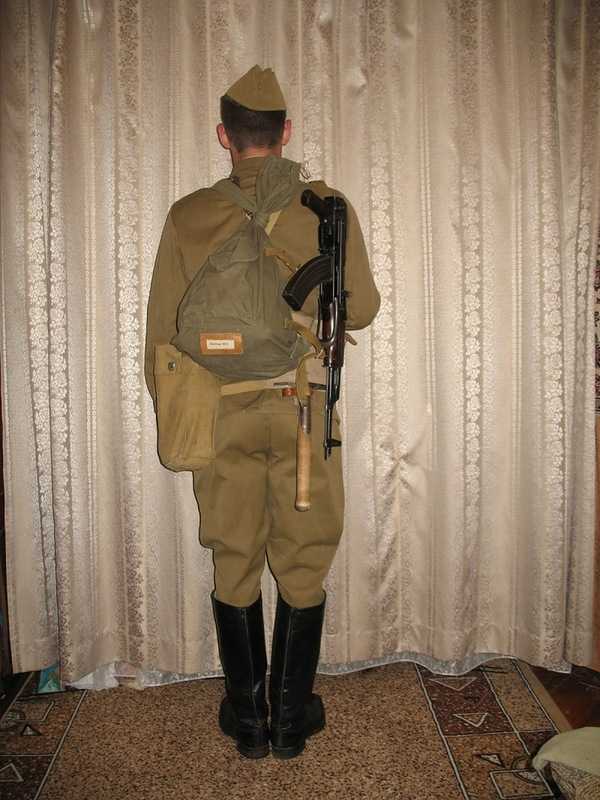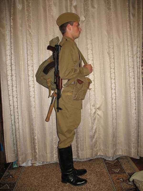 Советская форма и снаряжение образца 1969 года. На спине – вещмешок. Большая сумка на боку – противогаз.