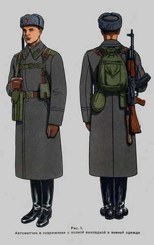 Советская форма и снаряжение образца 1969 года. Живая иллюстрация Правил ношения военной формы одежды. Брюки, китель, пилотка, сапоги. Снаряжение: ремень с плечевыми лямками из кожезаменителя. На ремне подсумок для магазинов (под правой рукой бойца) и гранат (под левой рукой), штык-нож. На плечах – лямки вещмешка с грудной перемычкой (образуют букву Н). Наискосок через грудь идет лямка противогазной сумки.