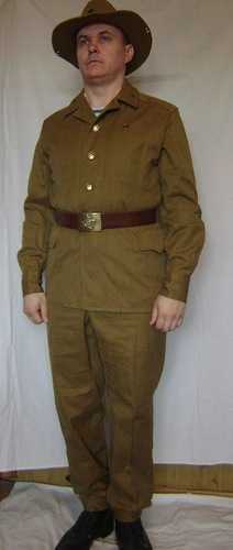 Шилась форма из плотной х/б ткани. Брюки имели два обычных врезных кармана сбоку, китель – два врезных кармана снизу. По сравнению с современными видами формы, да и по тогдашним западным меркам, это очень мало. Блестящие пуговицы и кокарды, а также цветные погоны в военное время должны были заменяться на зеленые.