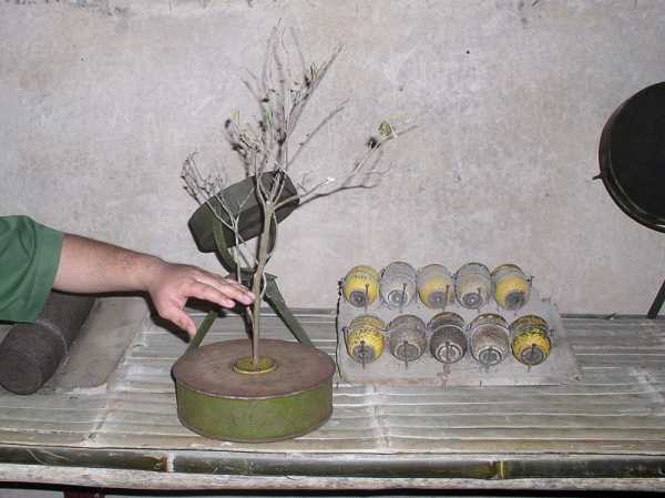 Ловушка-патрон нажимного действия в бамбуковом контейнере. Могли использоваться разные патроны, в том числе и охотничьи с дробью или картечью. Хотя все эти ловушки и выглядят эффектно, конечно же, ущерб от них не идет ни в какое сравнение с минами и гранатами на растяжках. Постоянно минируя территорию и ставя растяжки, вьетнамцам удалось превратить нахождение американских военных на чужой для них земле в настоящий ад.