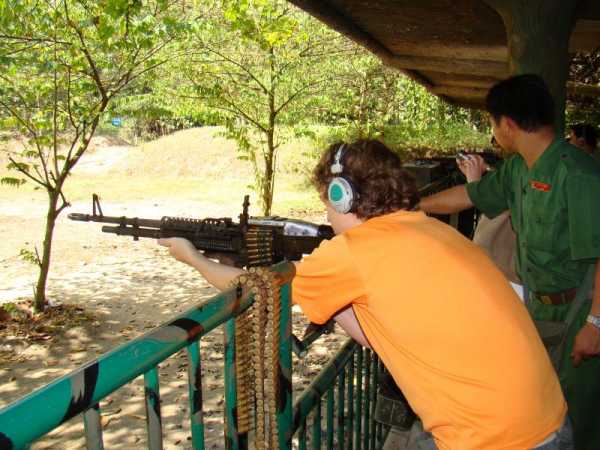 Изрядно попугав туристов, их выводят к партизанской кухне, где кормят похожей на печеную картошку вареной тапиокой с зеленым чаем, а потом и на стрельбище, где особо страждущие могут пострелять из нескольких крайне раздолбанных образцов советского и американского оружия, от 1 до 2 долларов за патрон. Из самых разных «Калашниковых» мне бесплатно дала пострелять Родина, а вот отказаться от пулемета М60 и знаменитого «томмигана» я не смог