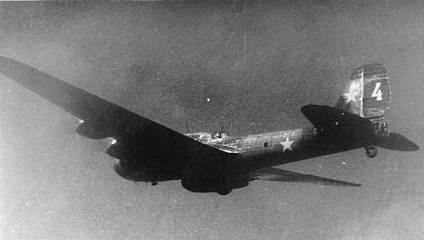 Вид на советский тяжелый бомбардировщик Пе-8 746-го авиационного полка дальнего действия.