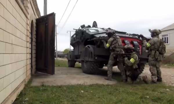 «Защищенный автомобиль» «Фалькатус» Центра специального назначения (ЦСН) ФСБ России в ходе совместной контртеррористической спецоперации ФСБ и МВД в поселке Ленинкент. Махачкала (Дагестан), 13.04.2016 (с) кадры с видео Национального антитеррористического комитета России