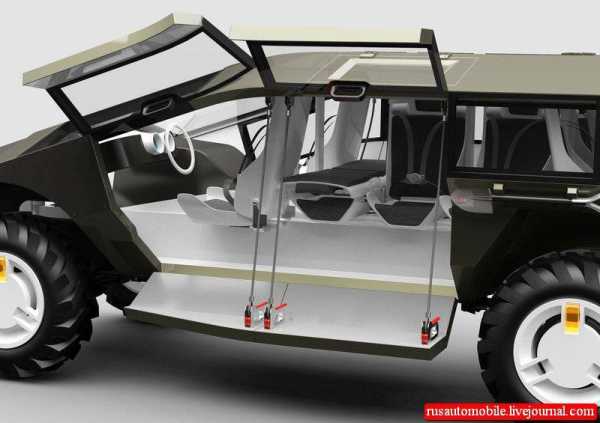 Однако насчет расположения водителя и обзора с его места точных данных нет. В Интернете имеются некие концепт-арты «Карателя», якобы имеющие самое прямое отношение к проекту и якобы просочившиеся из конструкторского бюро. На них видна примерная компоновка салона и оригинальная конструкция дверей. Так, при открытии их верхняя часть уходит вверх (крепится к крыше на петле), а поддерживаемая тросами нижняя – вниз, где служит ступенькой. При этом передние двери вместе с задними образуют достаточно широкие люки без центральных стоек. Вероятно, именно таким образом можно обеспечить нормальное открытие дверей при специфических обводах боков кузова, а также сделать посадку и высадку более удобными. На тех же 3D-рисунках можно заметить, что через каждую заднюю боковую дверь открывается доступ к двум креслам. Таким образом, вместе с водителем в такой комплектации одновременно могут ехать еще пять солдат (один на переднем сидении и четверо на задних). За «десантным отделением», по-видимому, располагается багажное. На имеющихся фото броневика его почти не видно, но куда лучше оно заметно на все тех же концепт-артах. На задней части машины имеется достаточно широкий грузовой люк с двумя створками. Примечательно, что створки эти имеют ковшеобразную форму и выступают за пределы кузова машины. Остается только гадать, зачем броневику подобные вещи, но на имеющихся фото можно заметить, что такая конструкция дверей багажника «дожила» до опытного экземпляра. Вместимость багажника, как и прочие параметры машины, пока не объявлялась.