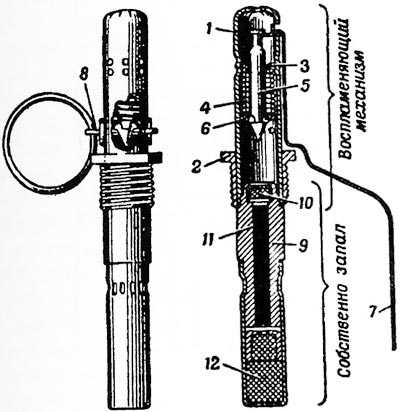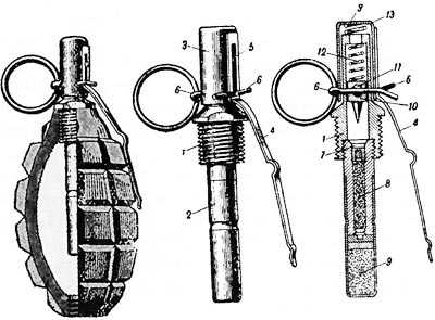 6 — предохранительная чека; 7 — капсюль-воспламенитель;
