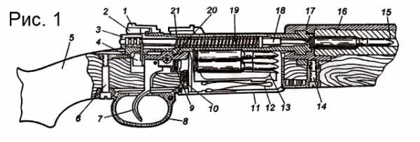 1. Ствольная коробка. 2. Соединительная муфта. 3. Курок. 4. Шептало. 5. Ложа. 6. Хвостовой винт. 7. Спусковой крючок. 8. Предохранительная скоба. 9. Спиральная пружинка. 10. Винт пружины защелки. 11. Крышка магазина. 12. Подающая пружина магазина. 13. Подаватель магазина. 14. Винт упора. 15. Пульный вход. 16. Патронник. 17. Кольцевой паз. 18. Ударник. 19. Боевая пружина. 20. Спусковой рычаг. 21. Стебель затвора