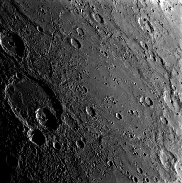 Аппарат MESSENGER приблизился к Меркурию для исторического первого пролета и добыл это великолепное изображение. Можно отметить различные поверхностные структуры, среди которых гладкие центральные равнины, множество кратерных шрамов и грубый материал, выброшенный из нижнего левого кратера. Аппарат сумел передать более 1200 снимков, которые помогли лучше понять развитие и историю планеты.