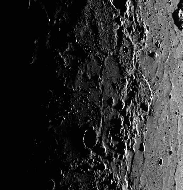 6 октября 2008 года состоялся ближайший проход аппарата MESSENGER к планете. За 58 минут до этого момента удалось поймать крупный план части поверхности. Формирования располагаются рядом с терминатором – линия между дневной и ночной сторонами. Это приводит к длинным и примечательным теням. Можно отметить два выделяющихся уступа, которые, кажется, пересекаются. Восточный также прорезает кратер, демонстрируя момент своего формирования уже после события удара.