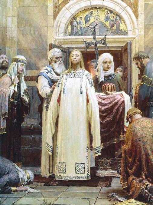 Святослав был тогда слишком мал, поэтому регентшей стала его мать Ольга. Она решила отомстить древлянам. С помощью хитрости княгиня сожгла их столицу Искоростень. Эта волевая женщина твердо держала власть в своих руках, пока рос ее сын. Больше всего Ольга известна тем, что в 855 году она отправилась в Византию, где приняла крещение. Она стала первой русской правительницей-христианкой. Обряд был совершен в главном константинопольском соборе Святой Софии.