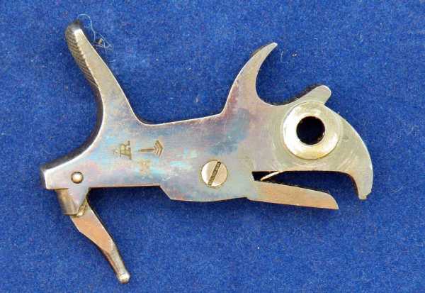 Спусковая скоба расположена с нижней части рамки и соединена с ней при помощи, запрессованной в рамку оси, и винта.