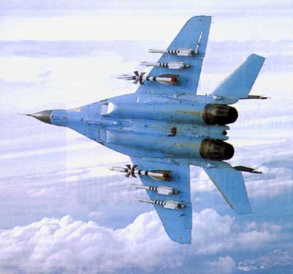 МиГ-29М. Данный летательный аппарат поставляется в части с улучшенным оборудованием. Турбореактивный двигатель истребителя оборудован форсажной камерой и управляемым вектором тяги.