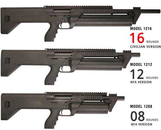 Вообще, говоря о многозарядном самозарядном ружье компании SRM, имеется в виду 3 модели оружия — Model 1216, Model 1212 и Model 1208. Все эти модели — это ружья 12-го калибра, о чем говорят первые две цифры в названии, оставшиеся две цифры указывают на количество патронов, которыми могут быть одновременно заряжены в магазин. Также эти три модели оружия различаются и по длине стволов, что сыграло злую шутку с производителем.