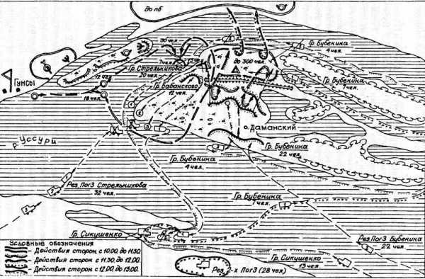 Спешившись, они двинулись в направлении китайцев двумя группами: первую вёл по льду начальник заставы ст.лейтенант Стрельников, вторую – сержант В.Рабович. Третья группа, которую вел ст. сержант Ю.Бабанский, двигаясь на автомобиле ГАЗ-63, отстала и прибыла на место на 15 минут позже. Приблизившись к китайцам, И.Стрельников выразил протест по поводу нарушения границы и потребовал от китайских военнослужащих покинуть территорию СССР. В ответ первая шеренга китайцев расступилась, а вторая открыла внезапный автоматный огонь по группе Стрельникова. Группа Стрельникова и сам начальник заставы погибли сразу. Часть нападавших встала со своих «лёжек» и ринулась в атаку на горстку советских бойцов из второй группы, которой командовал Ю.Рабович. Те приняли бой и отстреливались буквально до последнего патрона. Когда нападающие достигли позиций группы Рабовича, то добили раненых советских пограничников выстрелами в упор и холодным оружием. Об этом позорном для Народно-освободительной армии Китая факте свидетельствуют документы советской медицинской комиссии. Единственным, кто буквально чудом остался в живых , оказался рядовой Г.Серебров. Придя в сознание в госпитале, он рассказал о последних минутах жизни своих друзей. Именно в этот момент подоспела третья группа пограничников под командованием Ю.Бабанского.