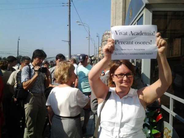 Юля Галямина вышла с плакатом «Vivat Academia! Pereant osores!» (Да здравствует академия! Да погибнут ненавистники наши!)