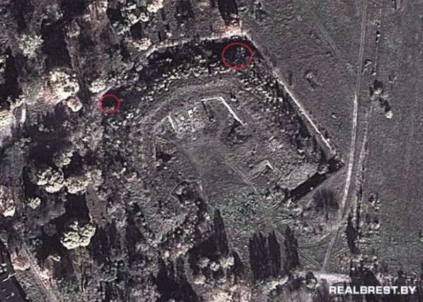 Красными кружками на фото из Google обозначены места активных несанкционированных раскопок в Западном форту. Фото: Реальный Брест |