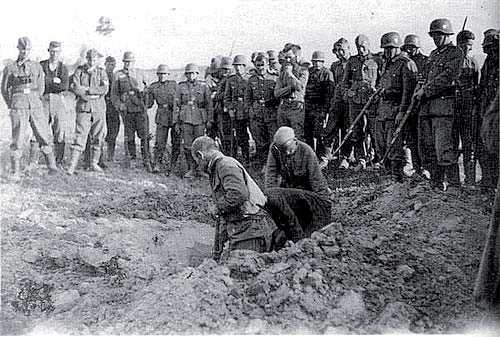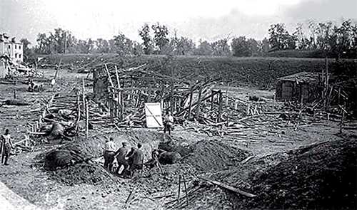 Сколько человек можно похоронить в воронке от обычного артиллерийского орудия? Пять, десять… Другое дело — массовое захоронение. Для такой цели подходит яма, которую оставлял снаряд немецкой тяжелой самоходной мортиры «Карл». Ее мощный бетонобойный снаряд весом 2.170 кг выстреливался с начальной скоростью 220 м/с и пробивал бетонную стену толщиной от 3 до 3,5 м или стальную плиту толщиной 450 мм. «Карл» из состава 1–й батареи 833–го дивизиона сделал по Брестской крепости 16 выстрелов. В среднем размер воронок в грунте имеет радиус 15 метров, в глубину — 5 метров…