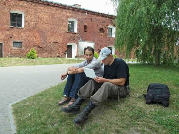 В понедельник были в Бресткой крепости. Там на двух участках начались археологические раскопки. Руководитель Александр Башков. Раскопки проводятся под строительство нового въезда в крепость через третий равелин и воронку на месте подорванных Михайловских ворот на одном участке. Второй участок — Тереспольский мост. Под воссоздание.Артем и Александр у Тереспольского моста