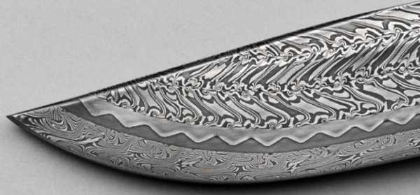 По своим узорам есть несколько разновидностей. Во — первых, полосатый узор, из параллельных прямых линий, что является признаком низкого качества. При более высоком качестве прямые линии чередуются с кривыми, хотя прямых, все равно больше, тогда это струйчатым булат. Когда же кривых линий больше чем прямых это волнистый. Далее идут, самые ценные сорта булатного метала: сетчатый, в котором короткие прямые линии пересекаются с кривыми, и даже не линиями, а завитушками. И коленчатый, в котором, по всей длине и ширине ножа повторяется замысловатый однообразный узор.