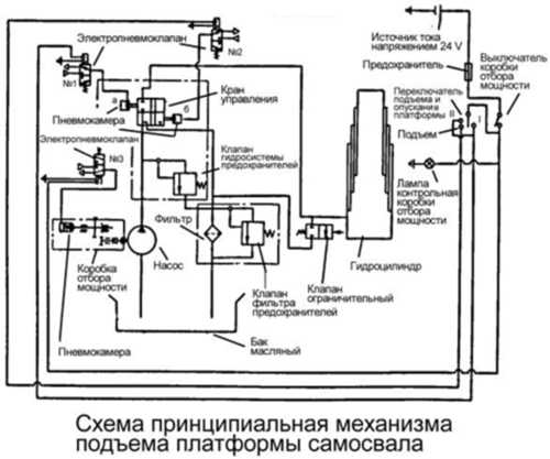 Поднимается и опускается конструкция за счёт гидравлической системы, которая состоит из: