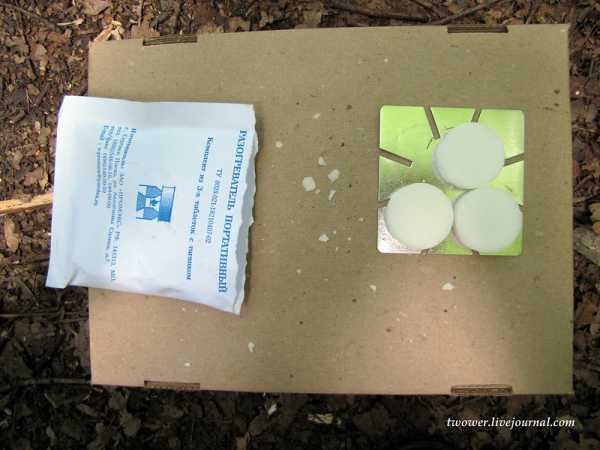 А вот на чем эту красоту греть: водоветроустойчивые спички (честно, они именно так и называются), таганок и четыре таблетки сухого спирта. Одной таблетки хватает минут на 20. Мне хватило десяти минут, чтобы разогреть две коробочки с едой.